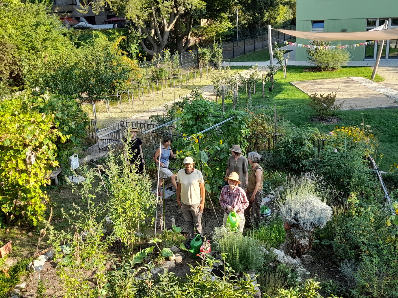 Dabei hat jeder von uns verschiedene Beete und Pflanzen im Blick: die Hochbeete und Kübel in der Nachbarschaft von Ulme und Pergola - mit Kürbis, Zucchini, Bl Kräuterspirale, die überdachten Tomaten, das begrünte Dach, das Magerbeet für Wildbienen, und vieles mehr.